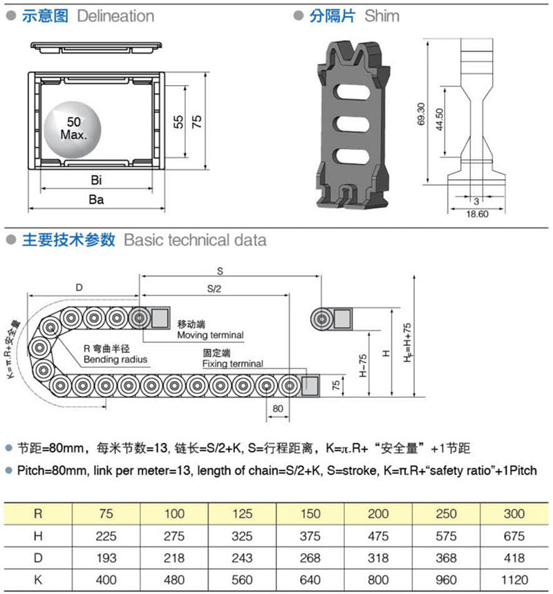 彎曲半徑:75 100 125 150 200 250 300