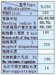 拖鏈型號TL250,支撐板Ⅲ型,彎曲半徑R=600,支撐板寬度Bi=400,拖鏈長度L=12000